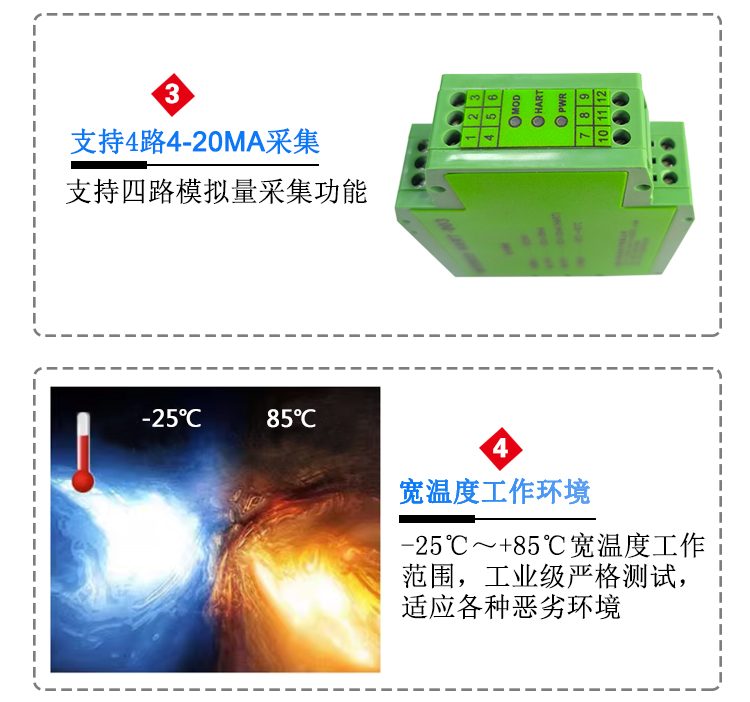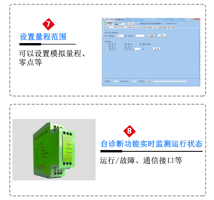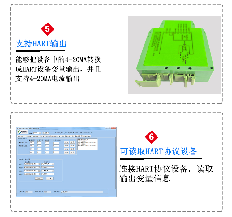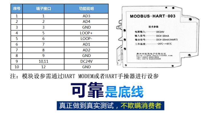 MODBUS-HART-003通過RS485接口與具有MODBUS-RTU通訊功能的設備進行通訊,能夠把設備中的數(shù)據(jù)轉(zhuǎn)換成HART設備變量輸出,并且支持4~20mA電流輸出。